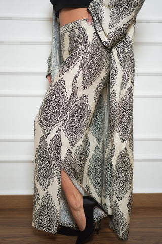 Flared trousers in lightweight rayon with an all-over black arabesque motif on a cream base. Contrast trim highlights the waistband. Includes side slits at the hem.