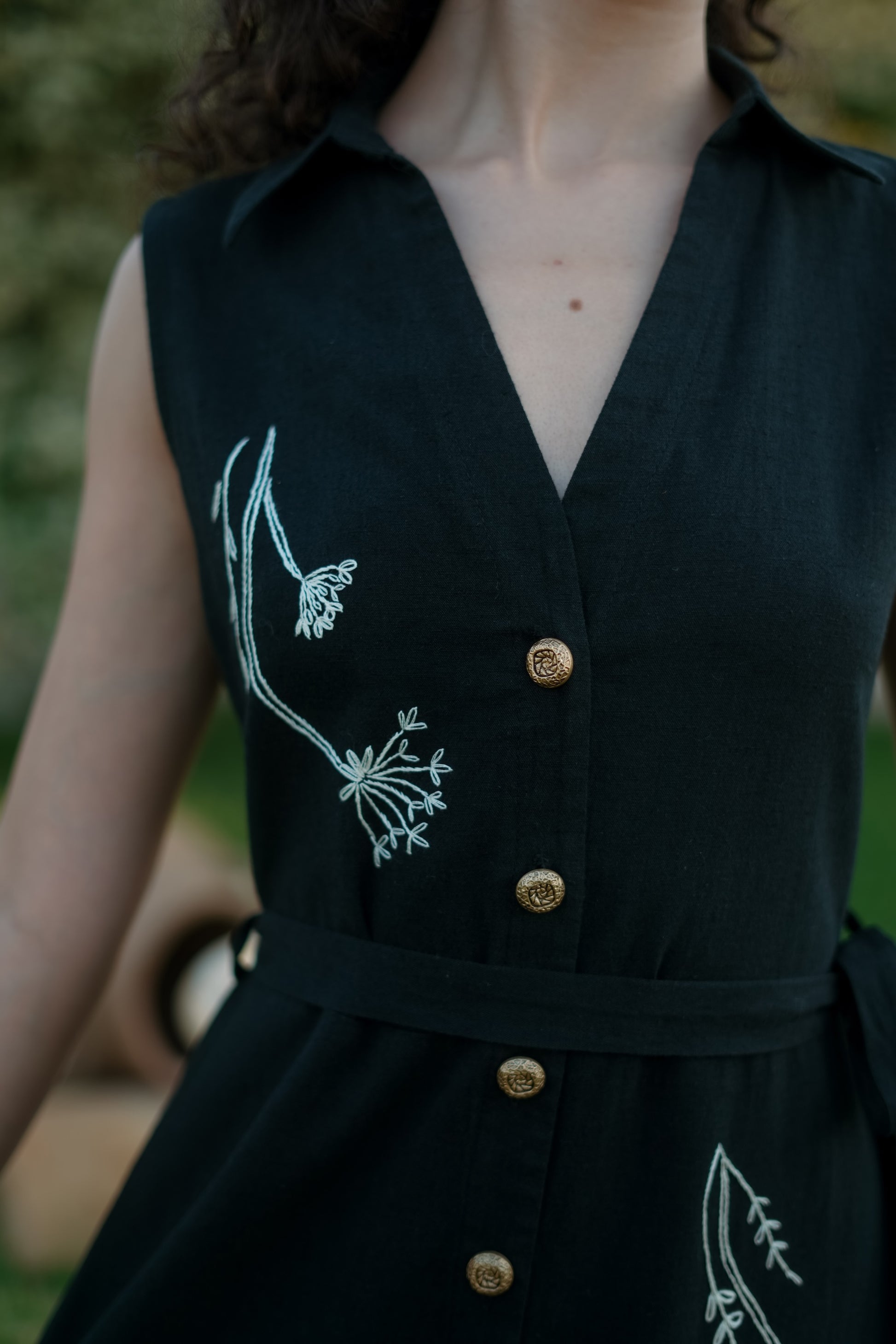 Maxi-length shirt dress in cotton-linen blend. Features a structured collar, button-down front, and long sleeves. Hand embroidered with scattered autumn floral motifs.