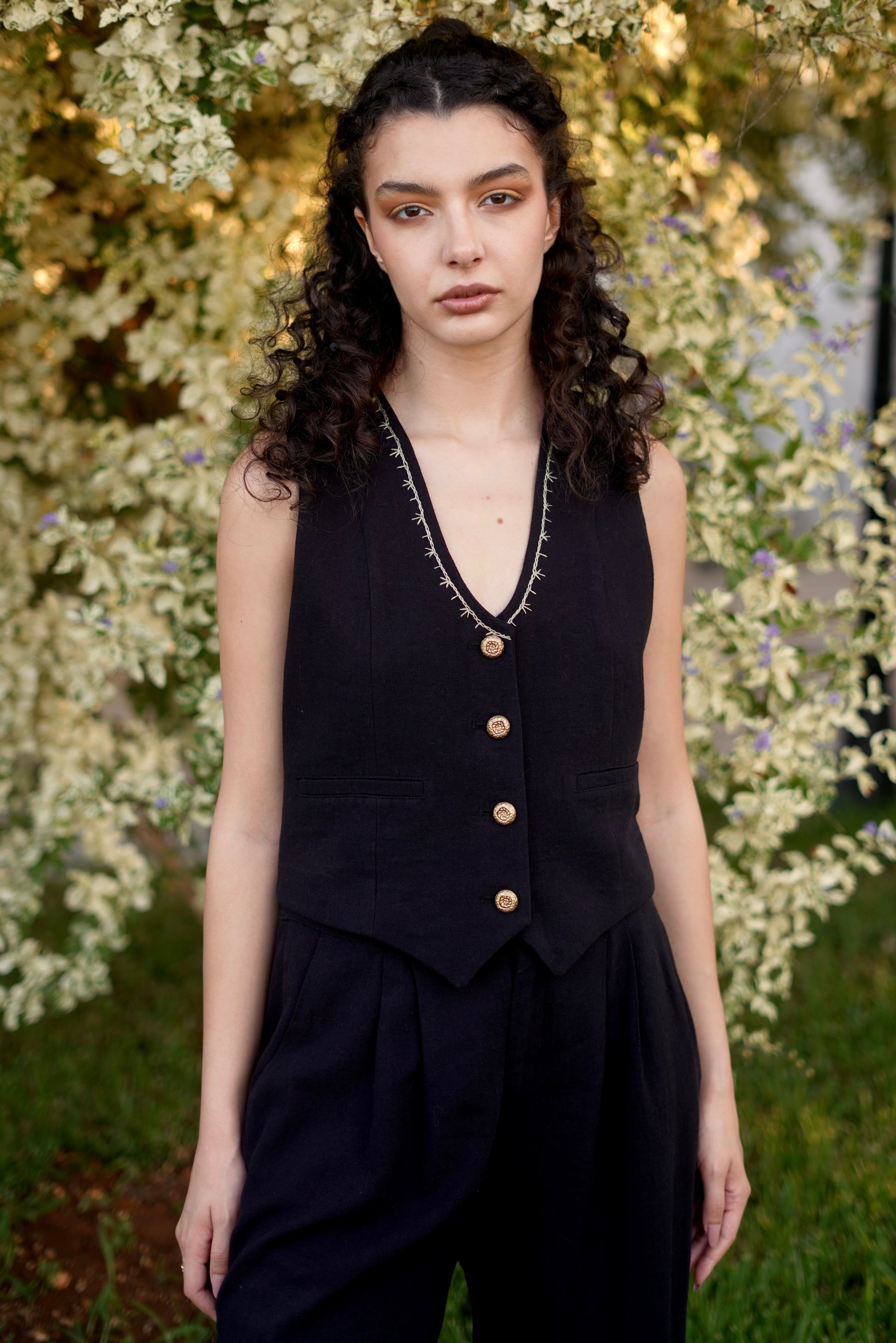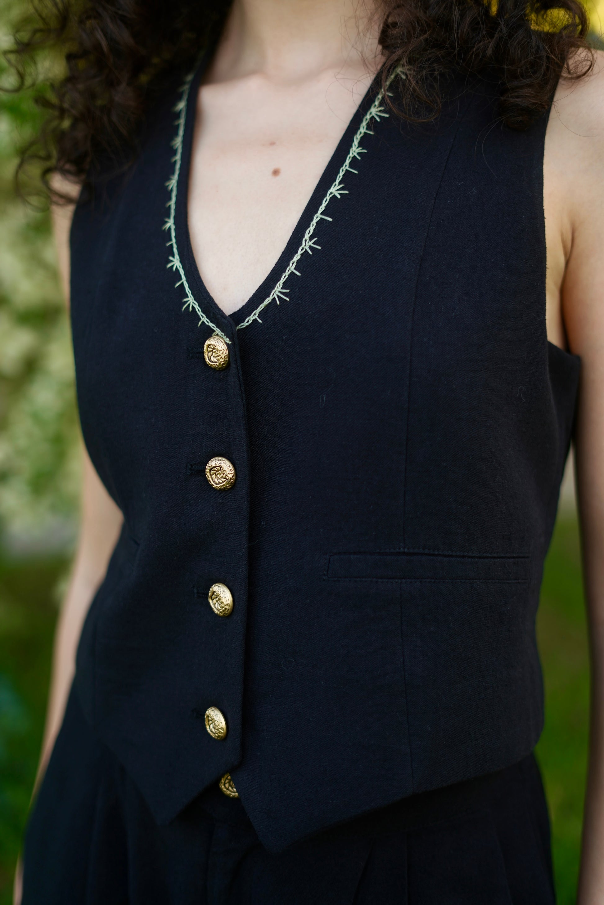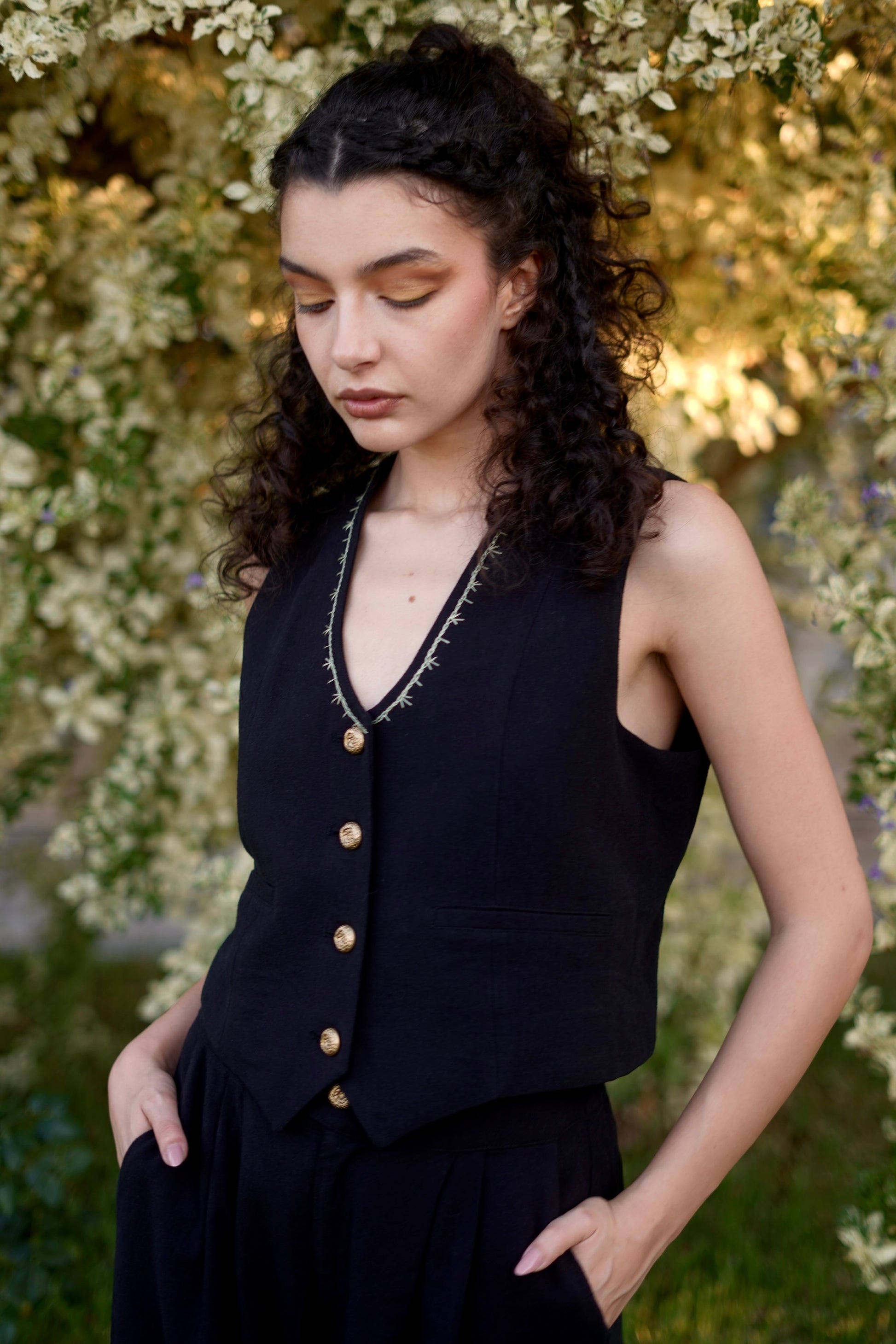 Cotton-linen vest with hand-embroidered stitch inspired by marguerite leaves. Finished with gold button closure at the front.