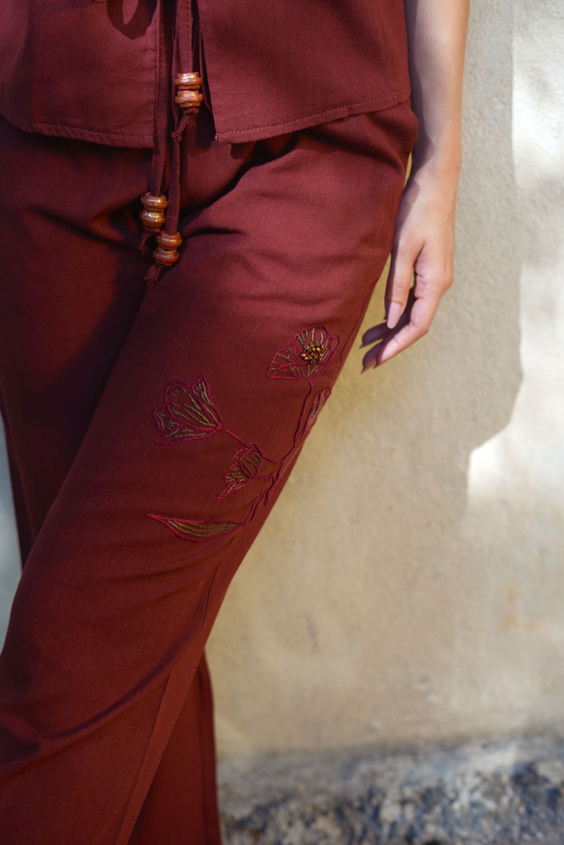 Full-length trousers in linen. Hand embroidered with bold red poppy flowers positioned on the thigh. Designed with a straight loose cut.