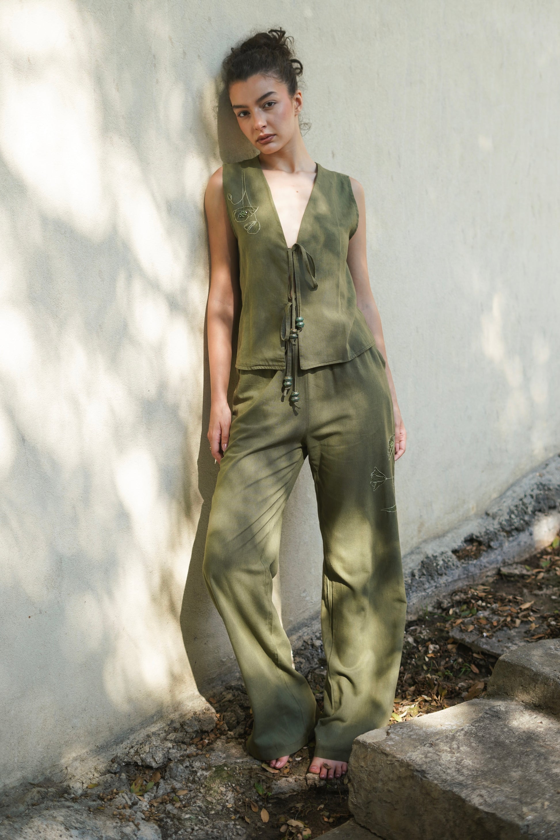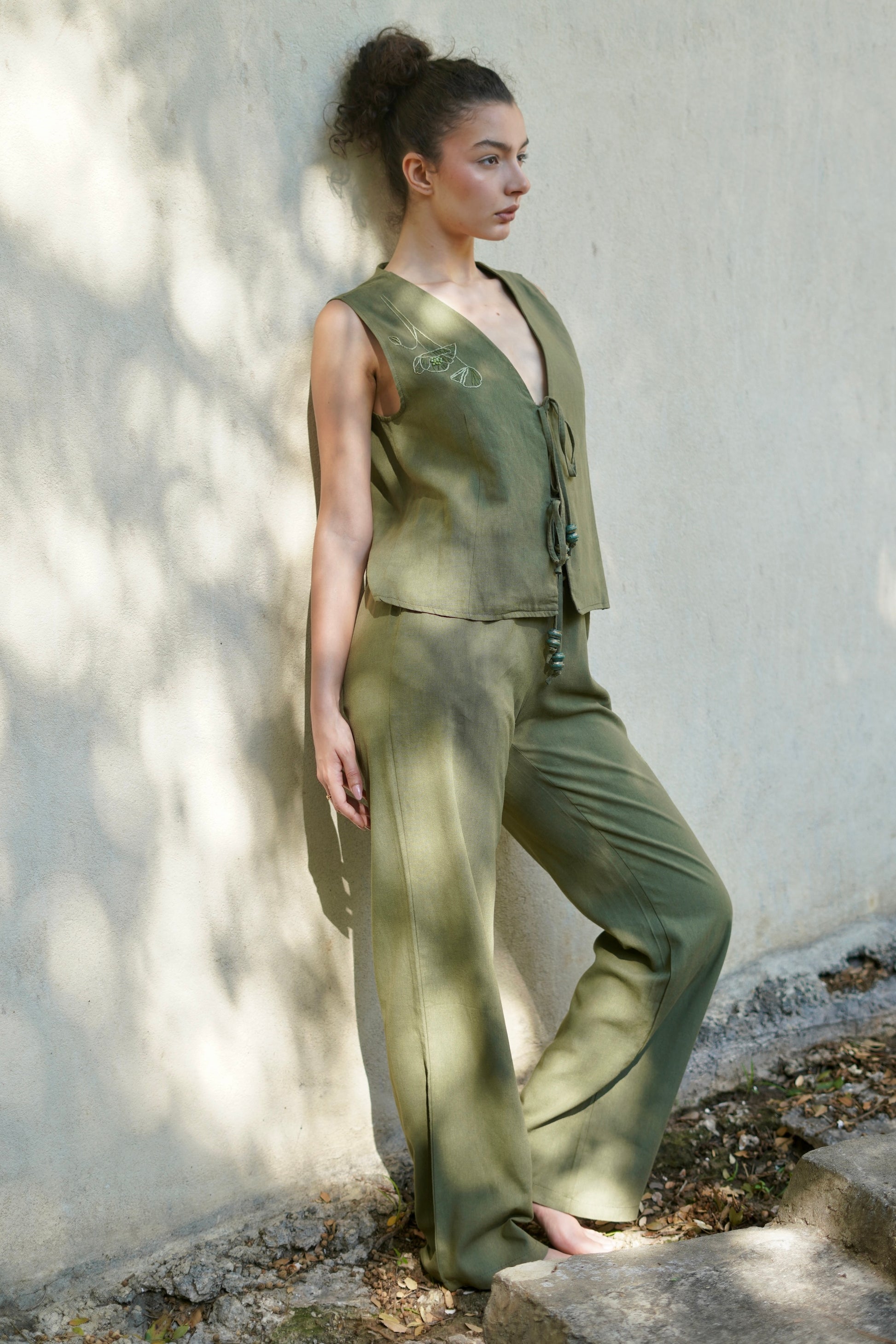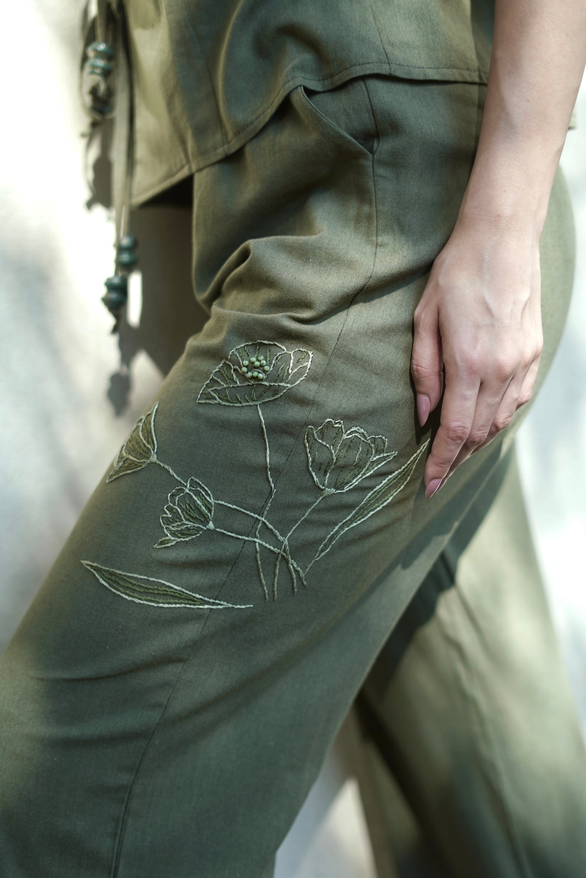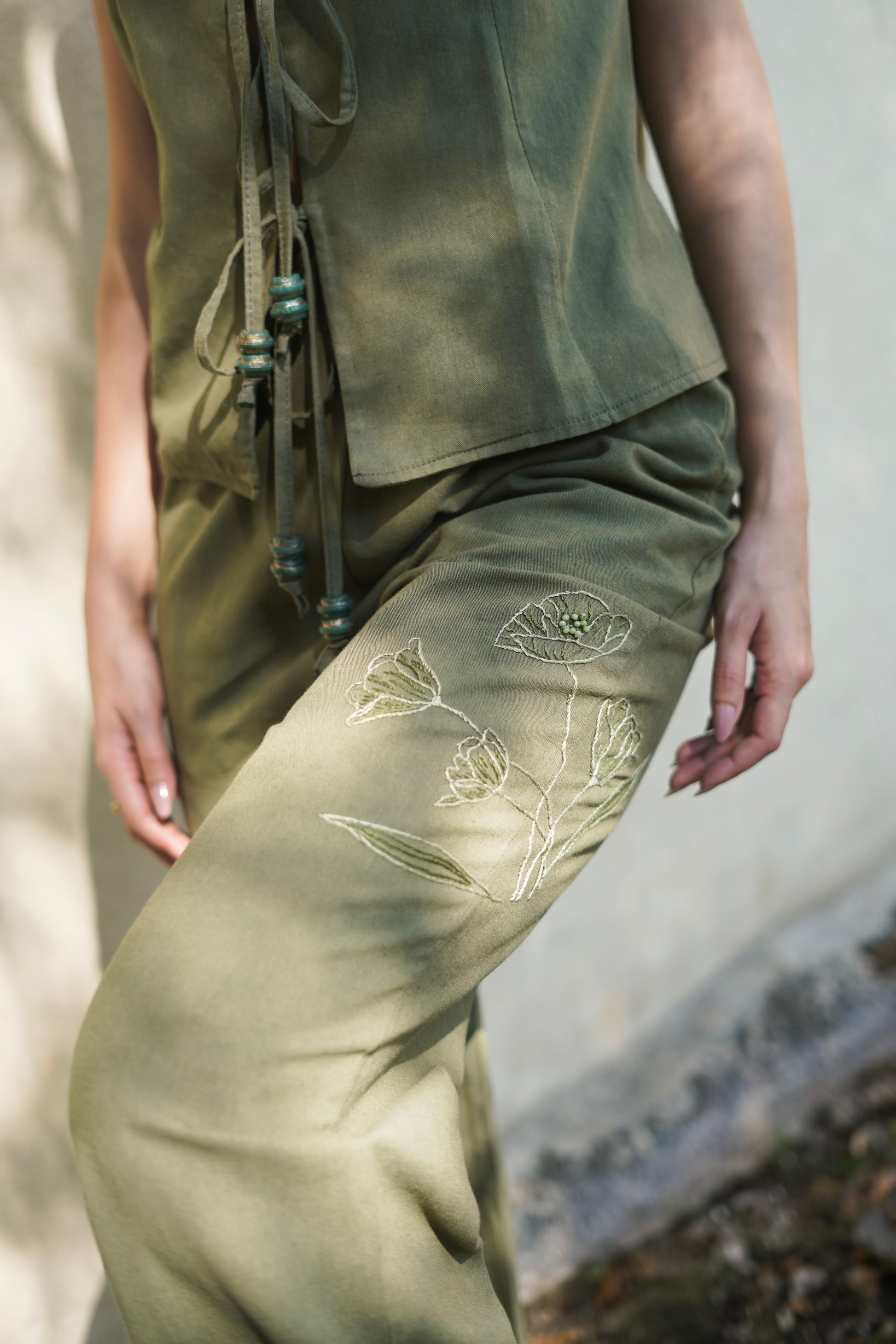 Full-length trousers in linen. Hand embroidered with bold green poppy flowers positioned on the thigh. Designed with a straight loose cut.