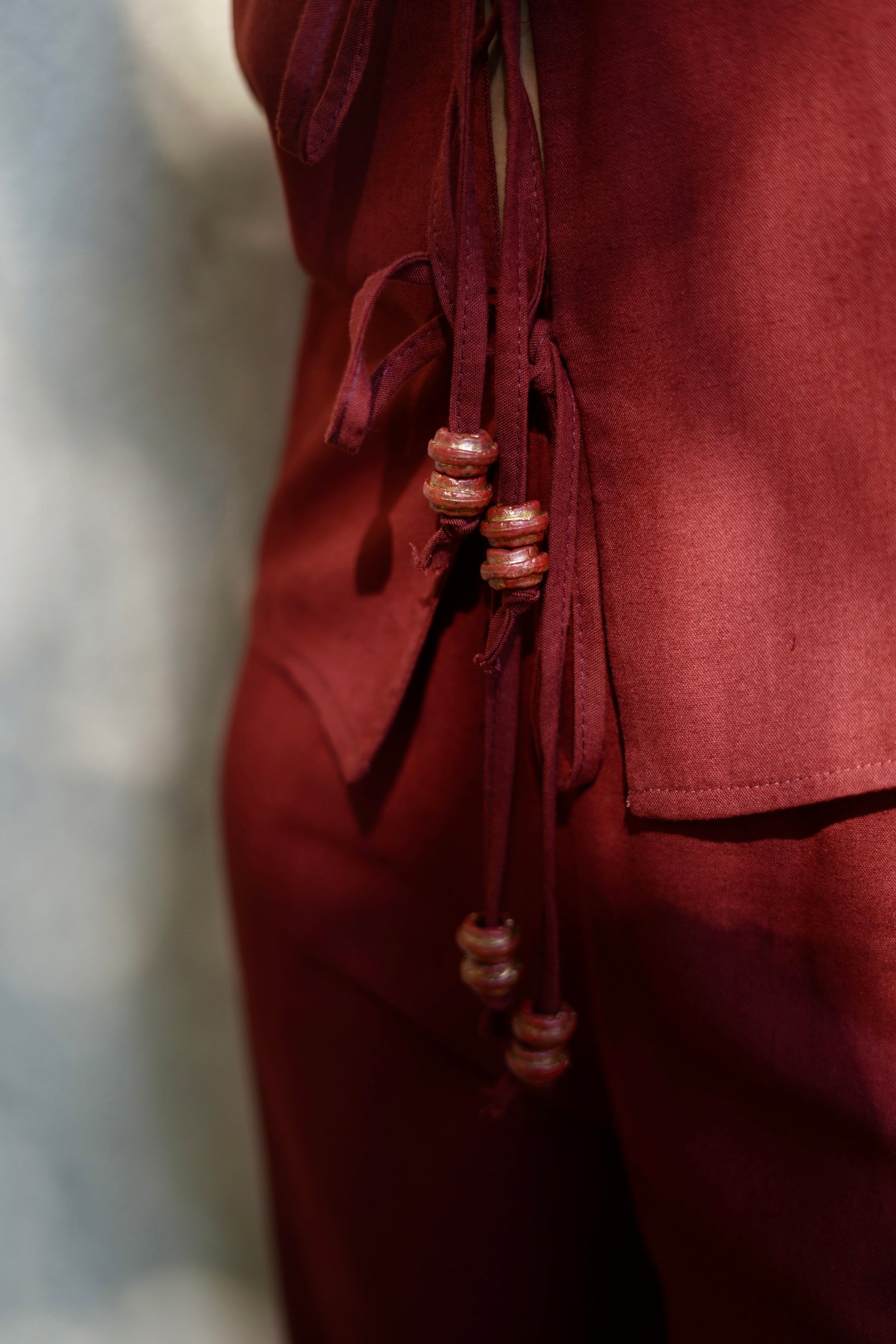 Linen vest with hand-embroidered red poppy motifs. Designed with a V-neck and beaded knot-tie closure.