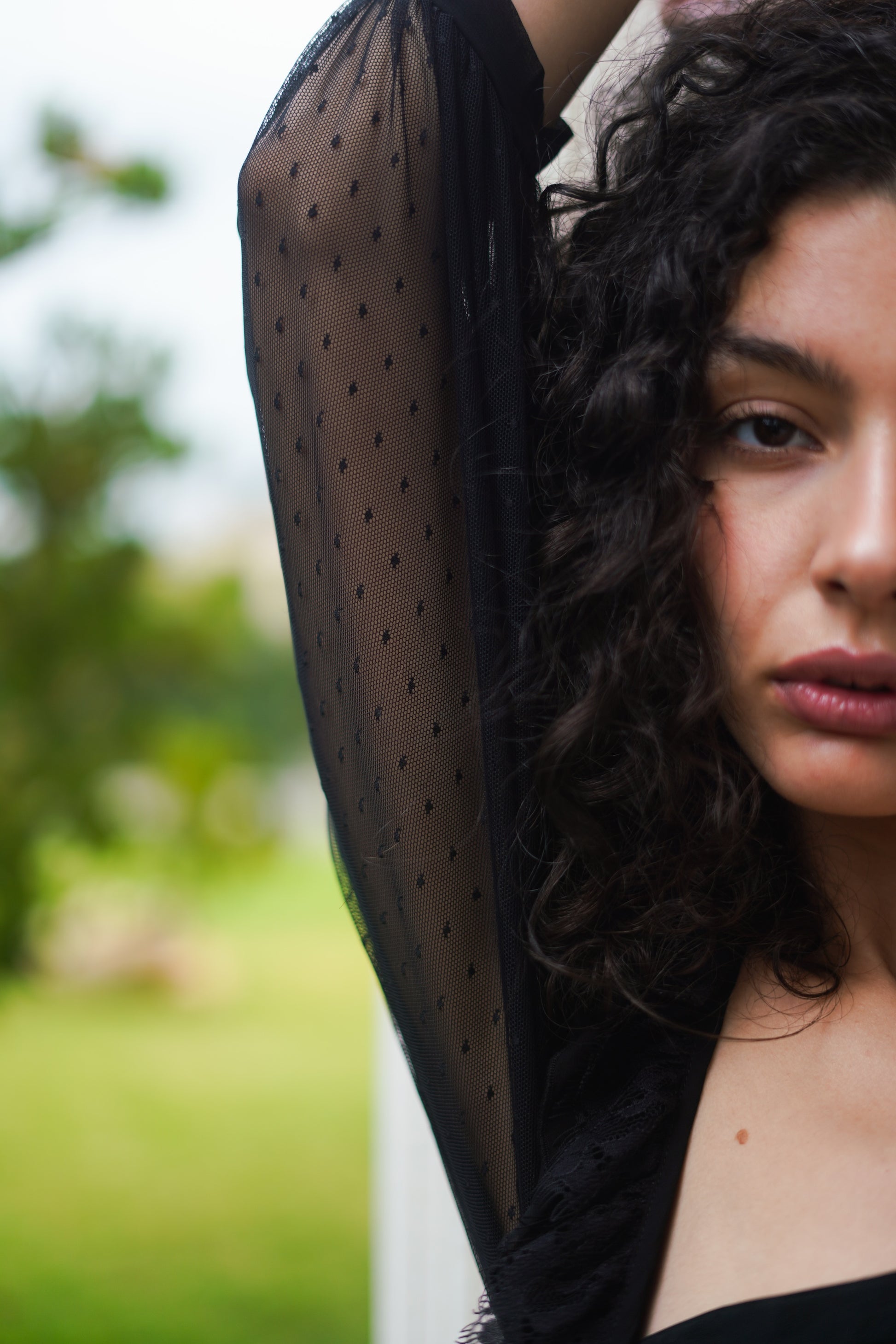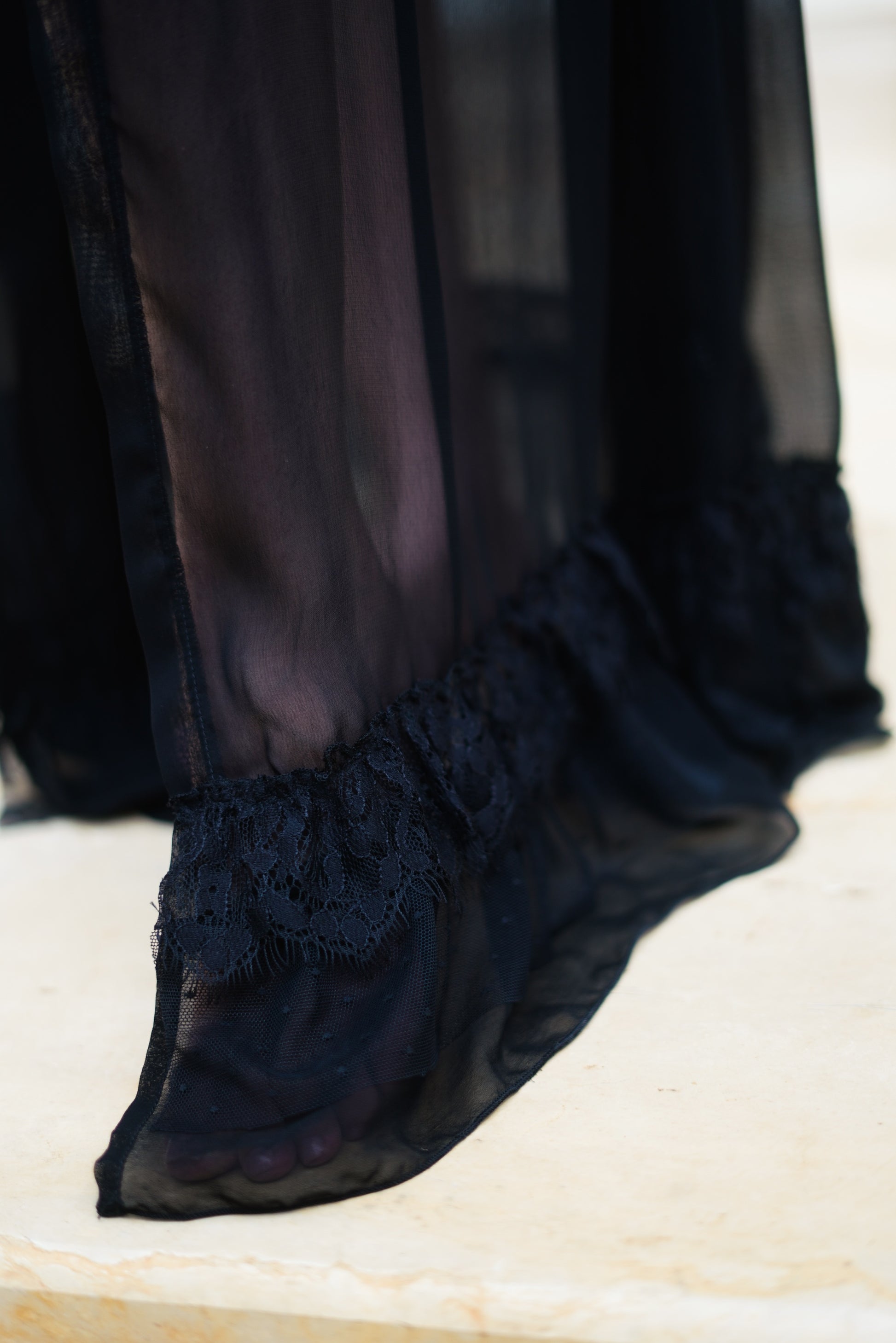 Maxi-length kimono in viscose chiffon featuring lace ruffles along the neckline and hem. Designed with an inner drawstring panel at the waist for adjustable closure and shaping. Secured at the front with self-fabric waist ties. Unlined.