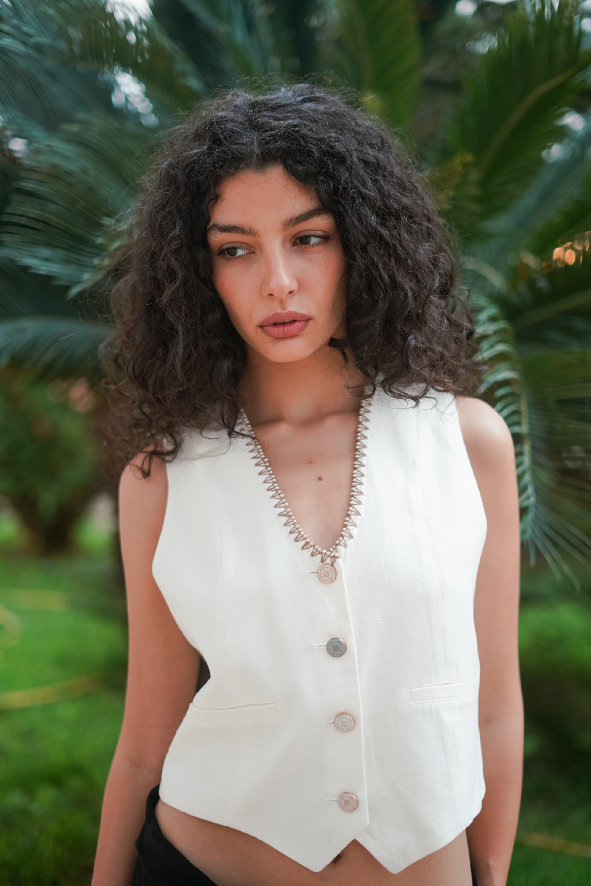 White linen-blend V-neck vest detailed with multicoloured pastel buttons and hand embroidery with beading around the neckline.